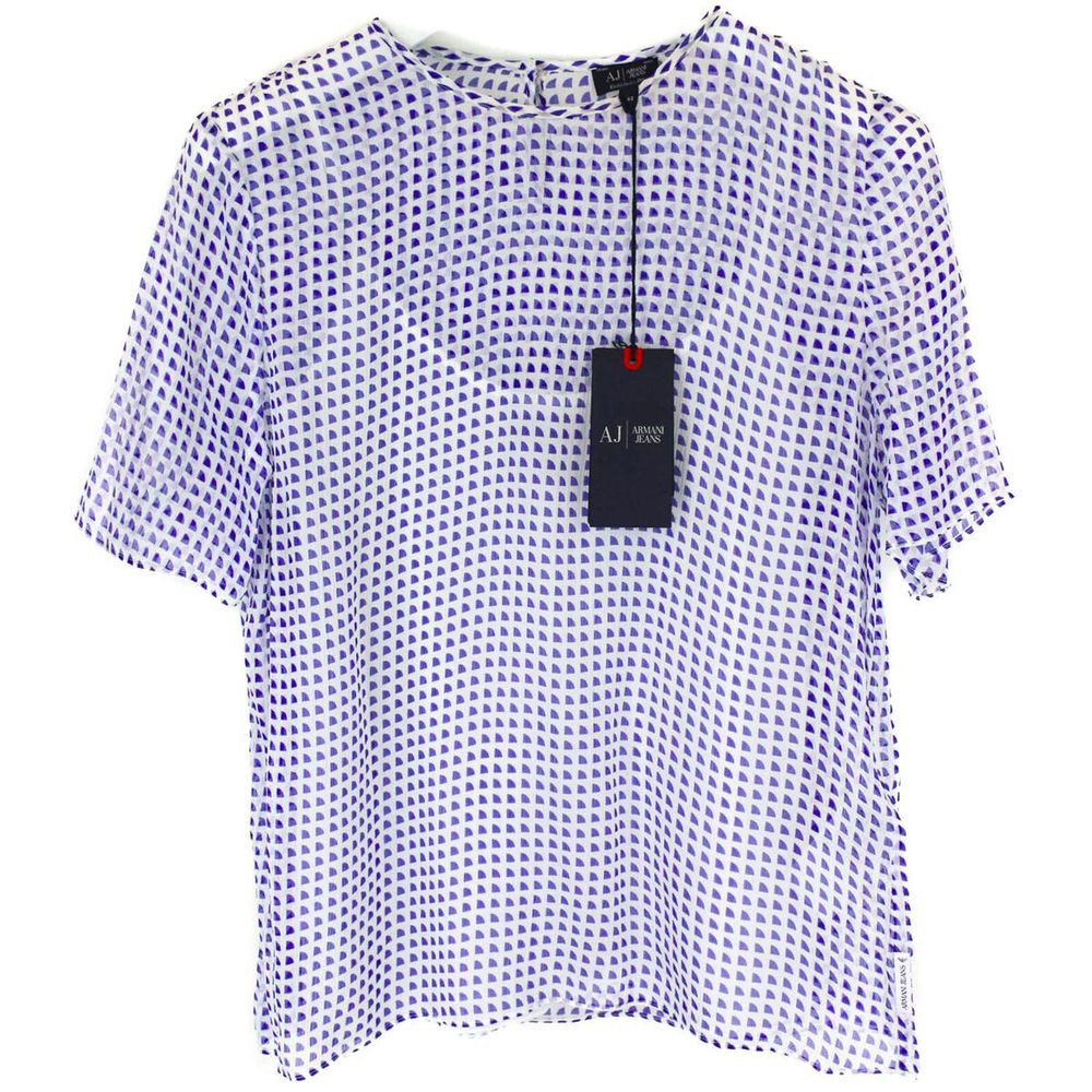 - Armani Jeans women's silk blouse with transparent finish, removable lining, white and blue geometric pattern print, crew neck.