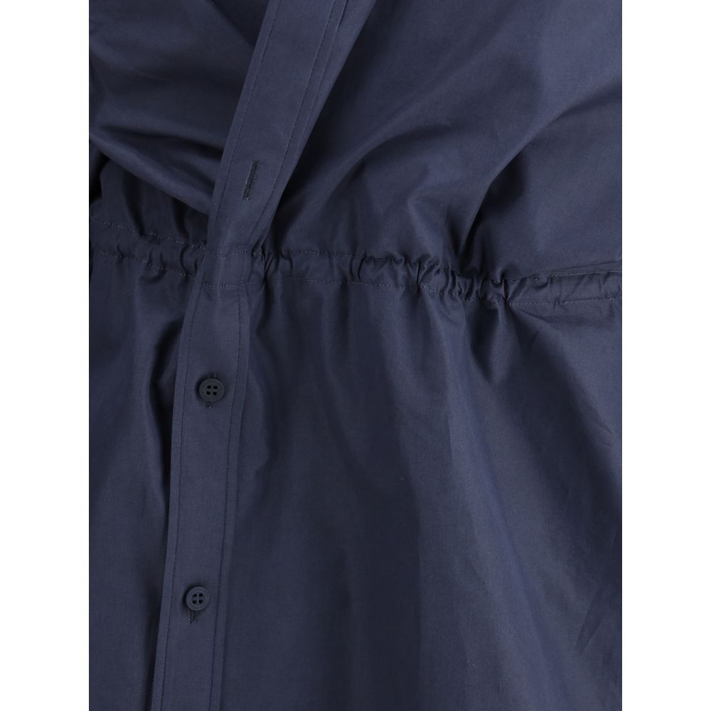 Balenciaga’s mini chemisier Dress represents a perfect fusion of elegance and modernity. This garment sports a classic collar that maintains a refined air, while the asymmetrical front button closure adds a touch of originality and dynamism. The elasticated waistband, adjustable via a drawstring, allows you to adjust the fit for optimal comfort and a more defined silhouette. Its mini shape lends a youthful, bold look that stands out for its functionality and contemporary design.