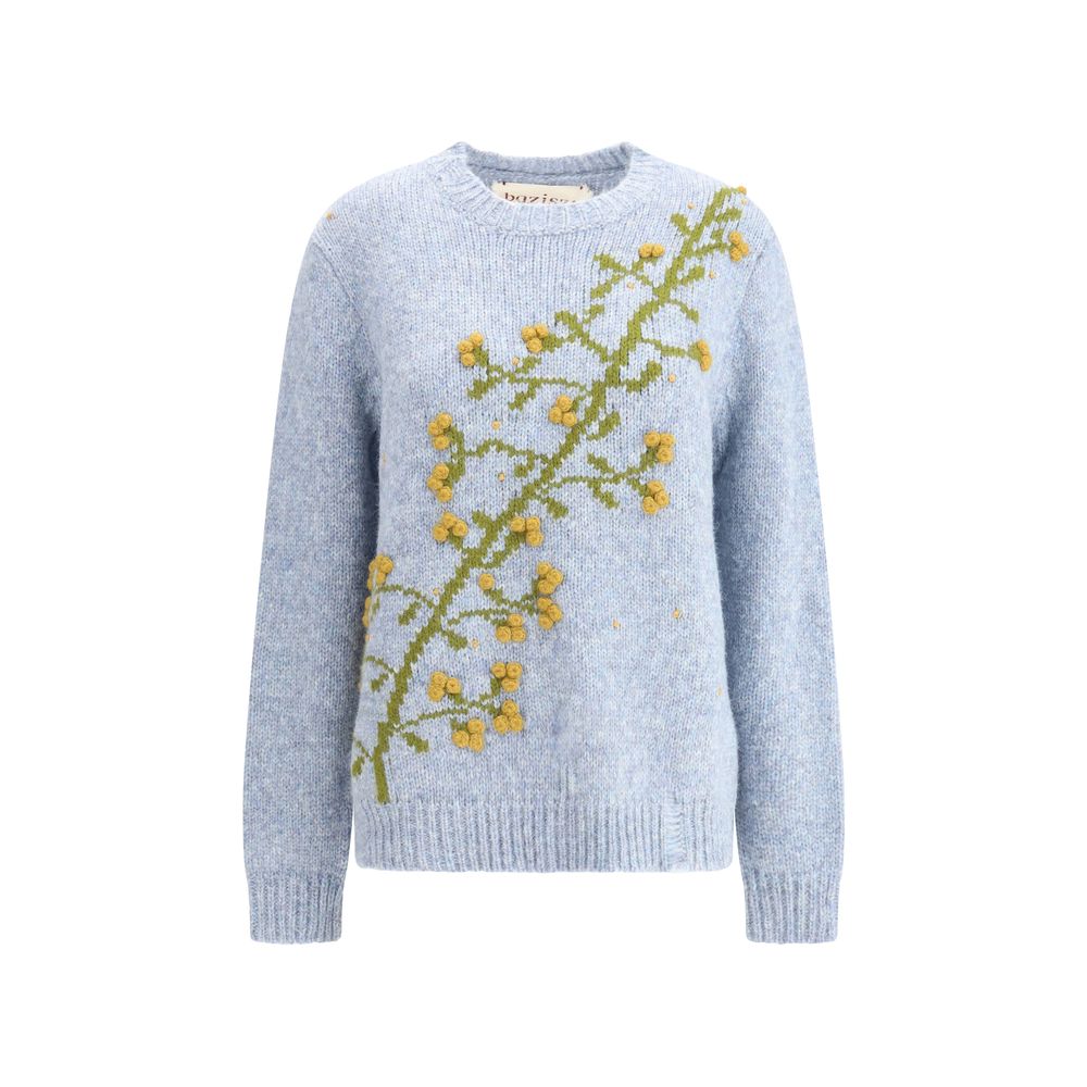 The Puff Sweater by Baziszt is a garment that combines elegance and comfort flawlessly. The crew-neck design and ribbing on the hem and cuffs give it a classic and practical feel, keeping it fitted and warm without sacrificing style. What really makes it special, however, are the details: the embroidered flowers on the front give a delicate and refined look, adding a more personal and artistic interpretation to the overall look. Perfect for those who are looking for a mix of simplicity and originality, this sweater will easily fit a variety of occasions.
