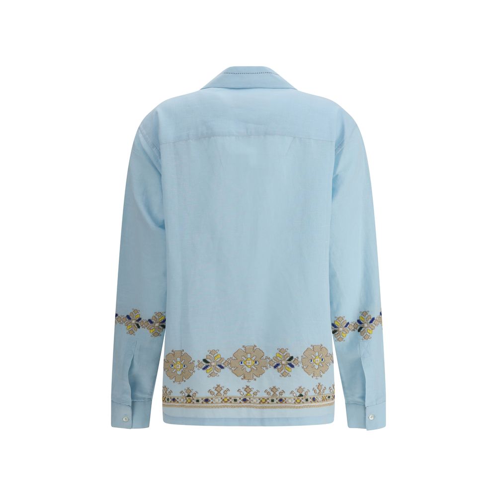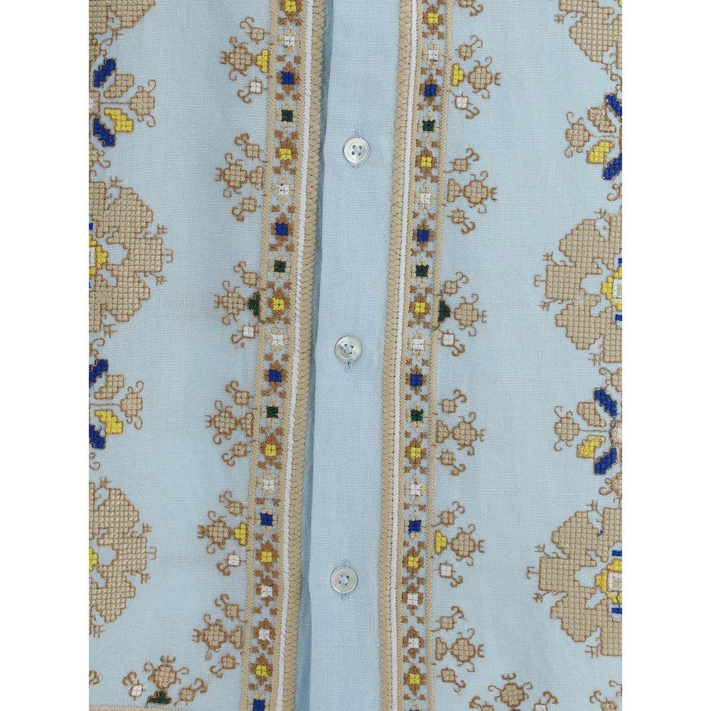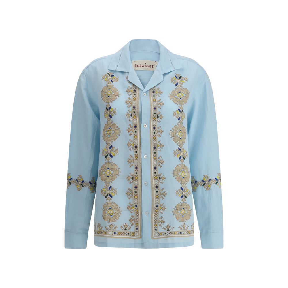 The Roses Shirt by Baziszt is a garment that stands out for its mix of elegance and delicacy. With a classic collar and front button closure, the shirt features a clean, refined design that is easily adaptable to a variety of styles. What makes it truly special, however, are the cross-stitch embroideries, both on the front and back, which give the garment a unique texture and handcrafted touch. The floral details, thanks to the cross-stitch technique, create a charming and feminine visual effect. The two side patch pockets complete the look, adding a practical and somewhat casual note without sacrificing its elegance.