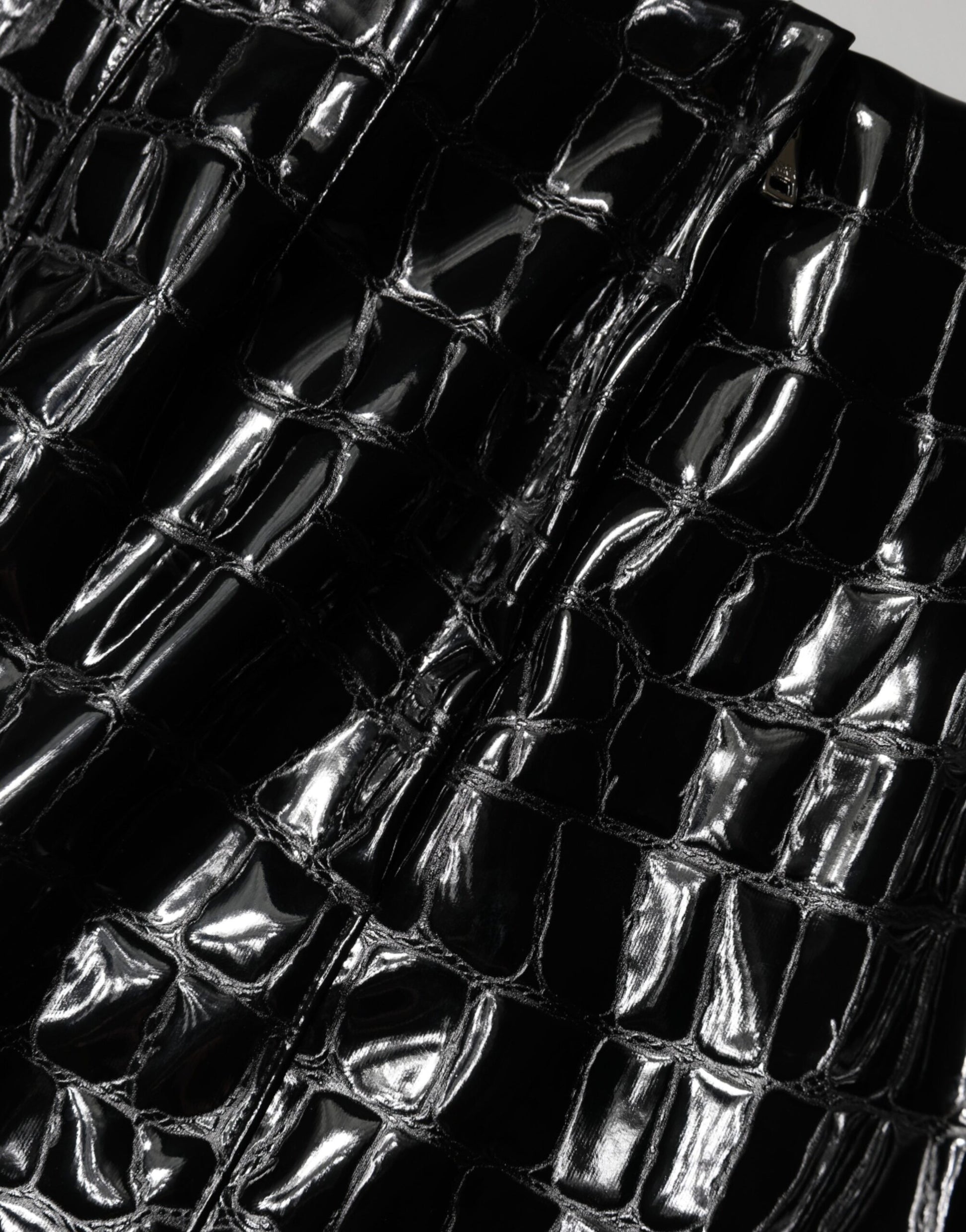 midi skirt features a croc-embossed faux-leather design with a flattering mid-waist silhouette. Sleek and modern, it combines bold texture with refined Italian craftsmanship for a standout statement piece.