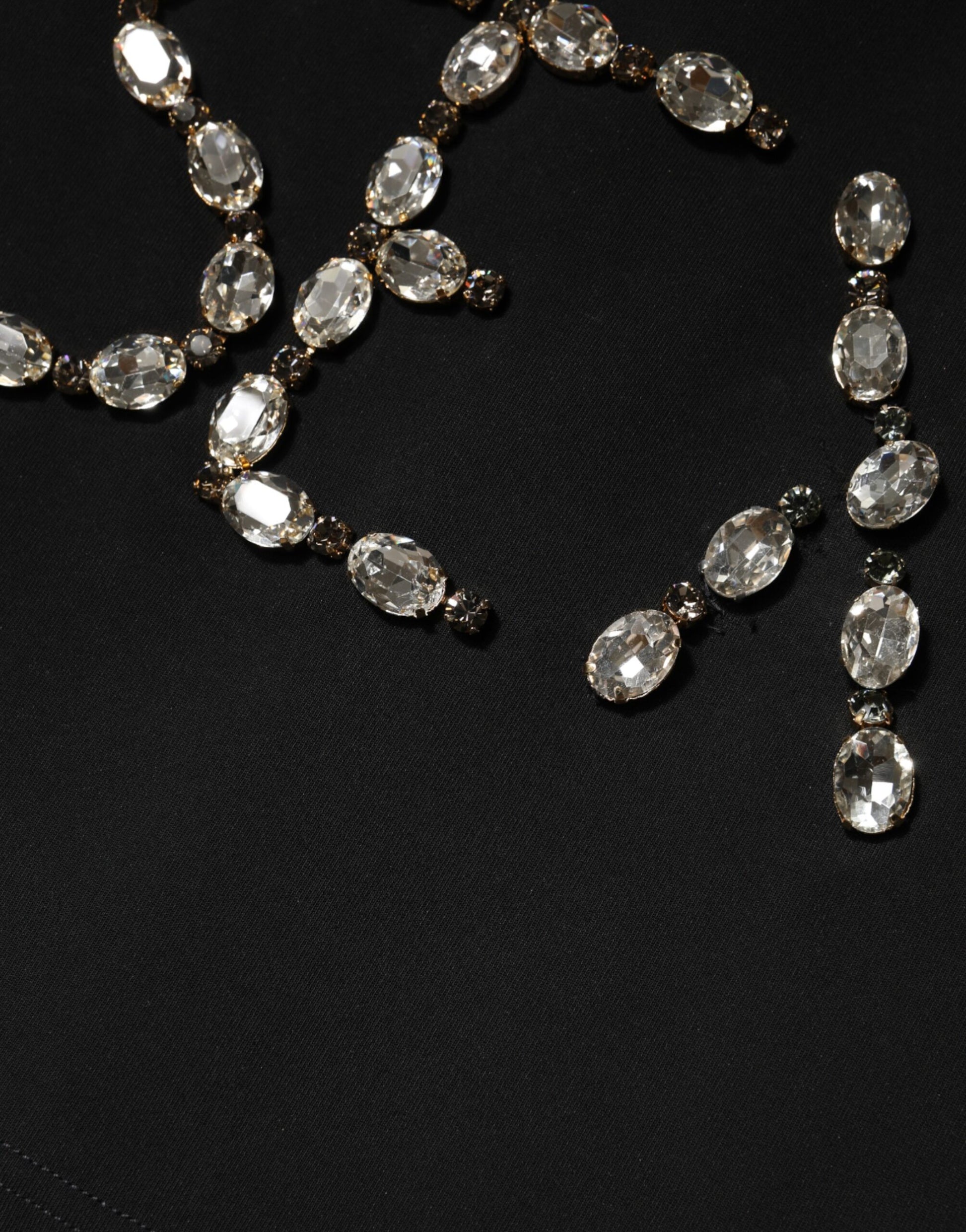 top embodies sensual sophistication with its black jersey base and delicate lace accents. Designed with elegant ruching and embellished with sparkling rhinestones, it flatters the figure while adding a touch of glamour. Perfect for evening occasions or stylish layered looks.