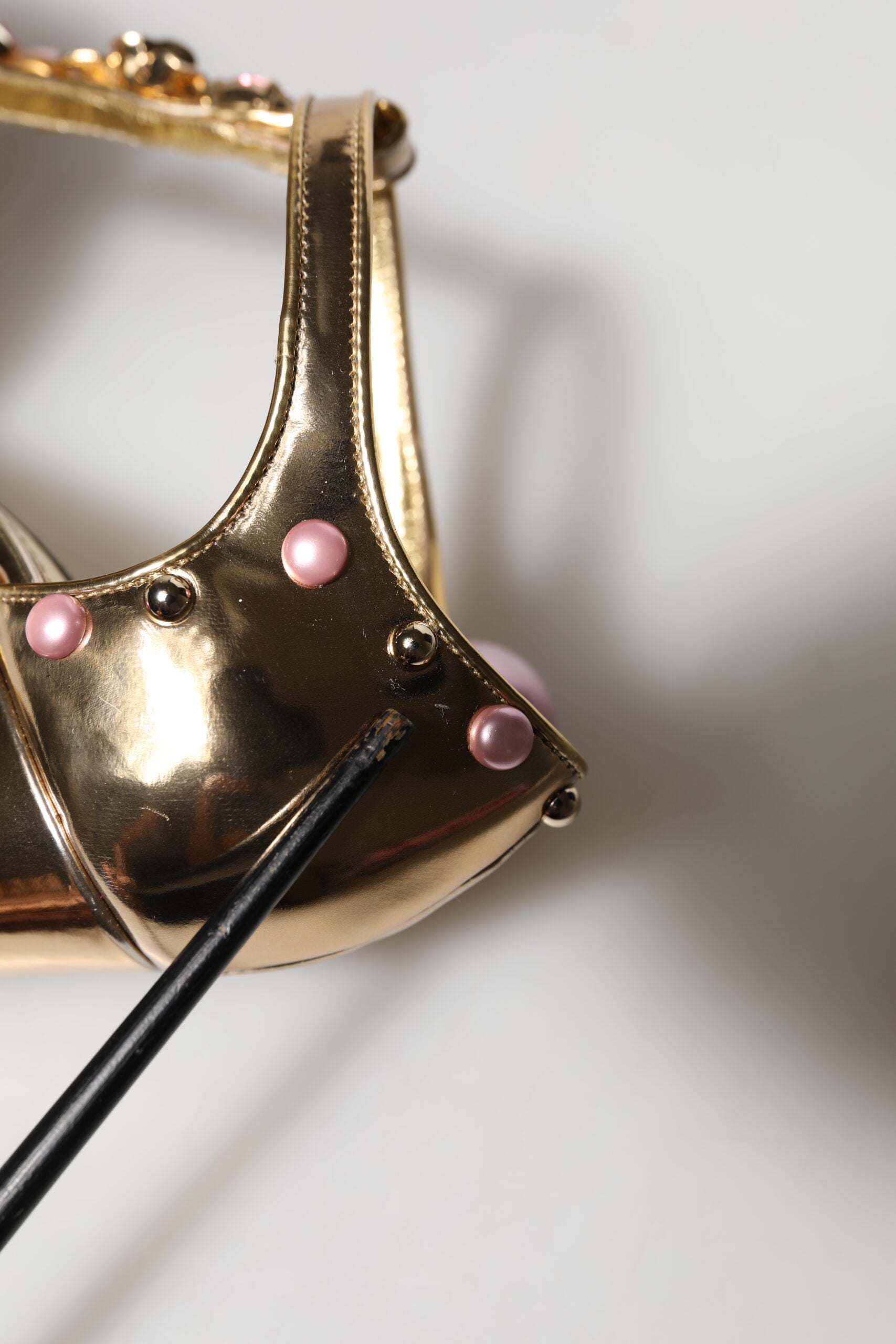 sandals feature a metallic gold finish adorned with intricate embellishments. Designed with the signature Vally heel, they combine elegance and glamour, making them a striking choice for evening events and special occasions.
