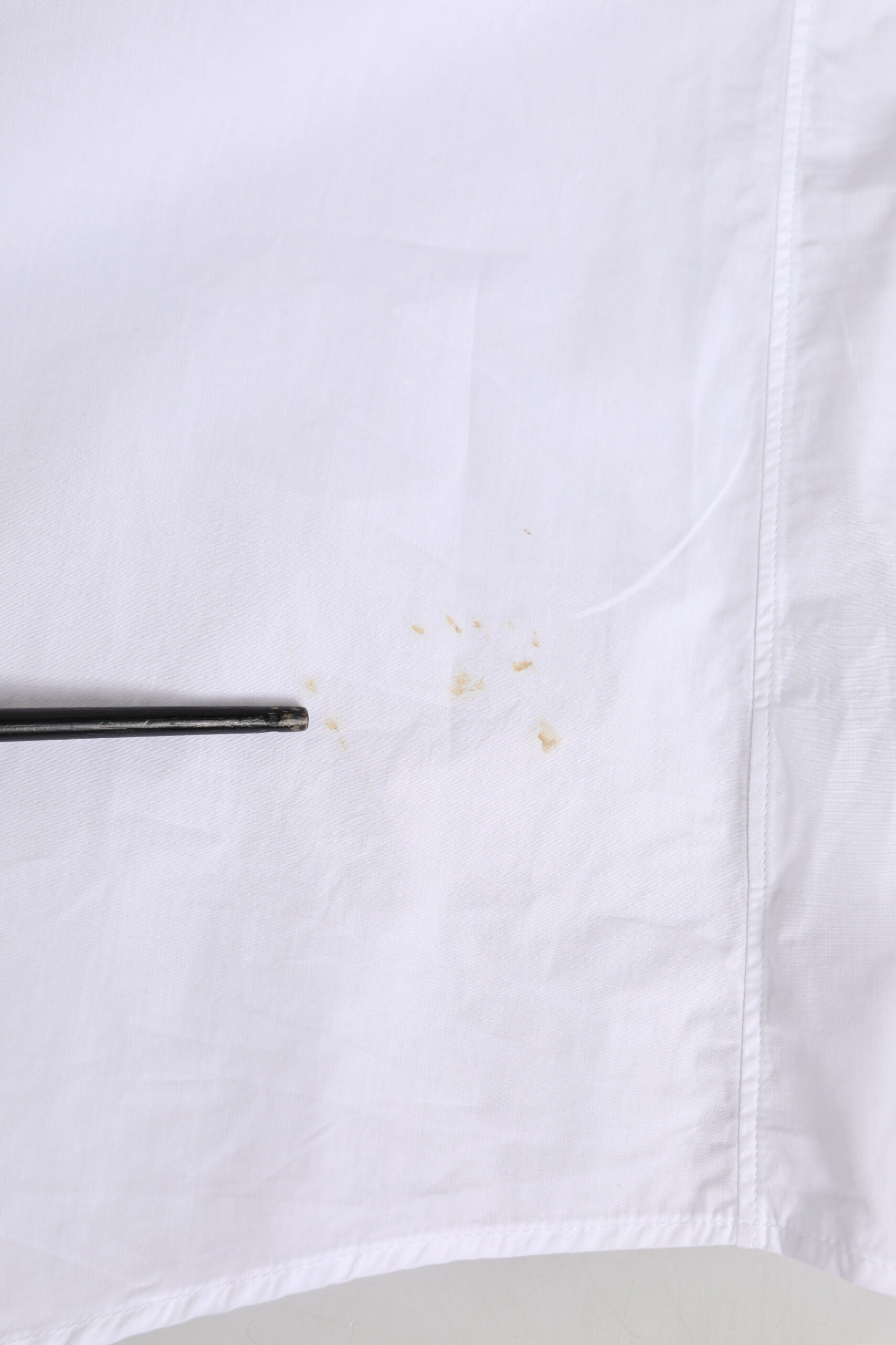 Made in ItalyThis item has a minor defect, there is a stains around the collar buttonhole, marks on the lower back, and discoloration on the cuff (see pictures for details).