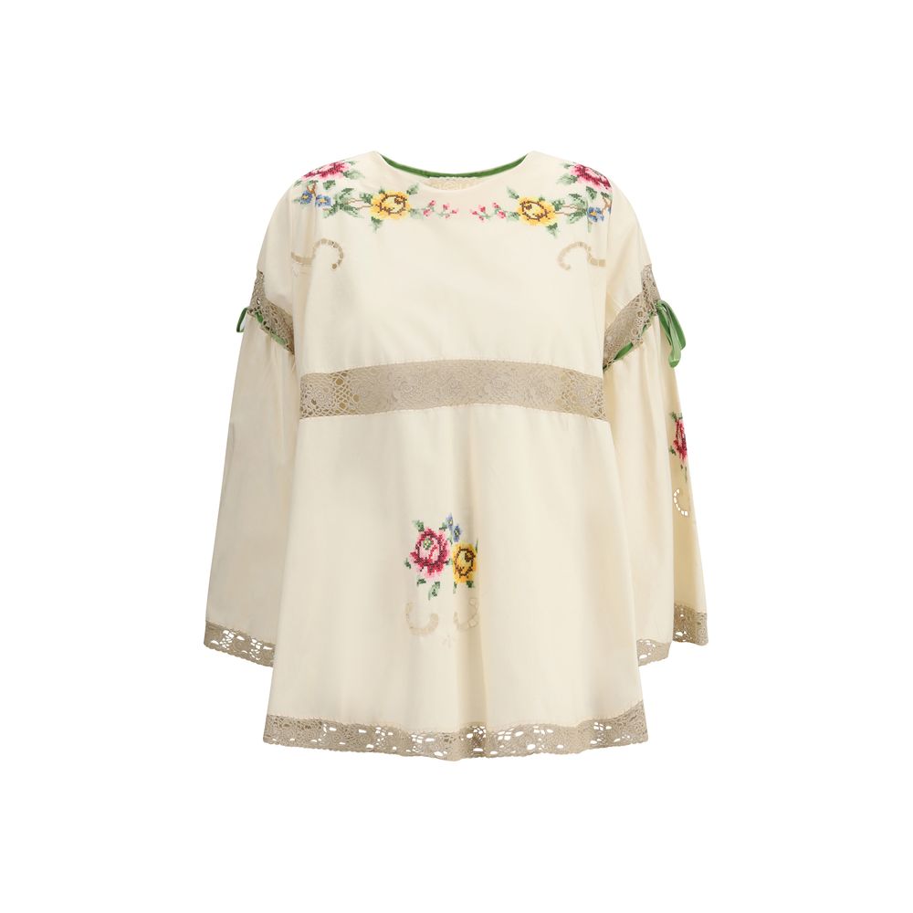 Ella’s cotton Blouse is a versatile and refined garment featuring a simple crew neck that enhances its clean, sophisticated silhouette. The long sleeves are embellished with velvet ribbons that add a touch of understated elegance. The asymmetric hemline lends a modern note to the design, while the sangallo lace details and floral motifs made with cross-stitch recall a traditional art, enriching the garment with delicate workmanship. Perfect for a casual-chic look or for pairing with a smart jacket, this blouse combines comfort and style flawlessly.