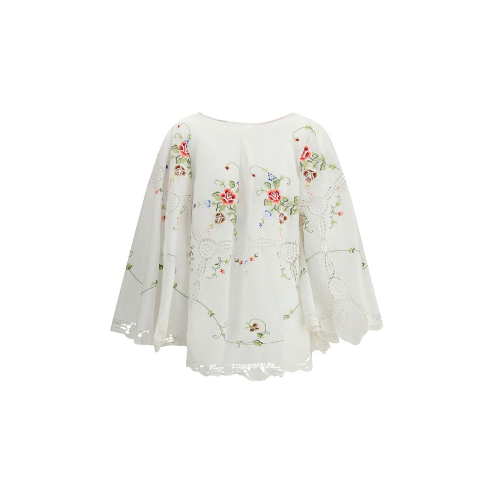 Ella’s cotton Blouse is an elegant and cool piece featuring a round neckline and flared sleeves that give a soft, flowing silhouette. The asymmetrical hemline adds a modern touch, while lace details and all-over floral appliqués enrich the design, giving it a romantic and sophisticated air. Perfect for a chic and refined look for any occasion.