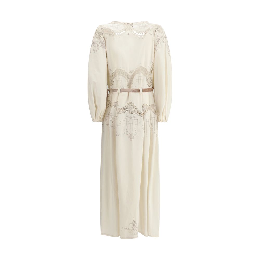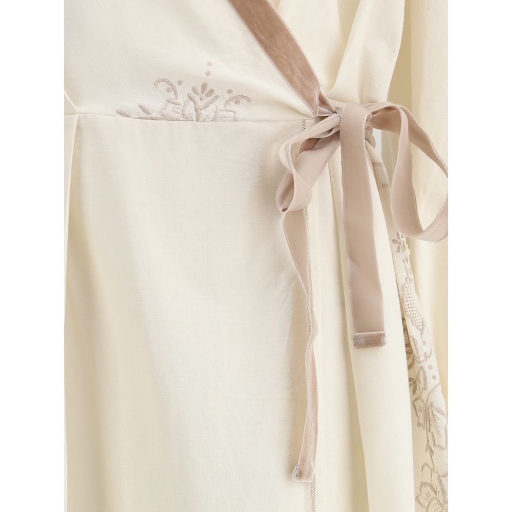 Ella’s Impero Long Dress is a garment with timeless appeal, combining elegance and sophistication in a sophisticated design. Its crossover front, combined with a closure via a knotted velvet ribbon at the waist, enhances the figure with a sleek silhouette. Long puff sleeves add a touch of romance, while sangallo lace inserts lend a delicate contrast of texture. The deep V-neckline and all-over embroidered flowers further embellish the dress, lending an air of femininity and elegance.