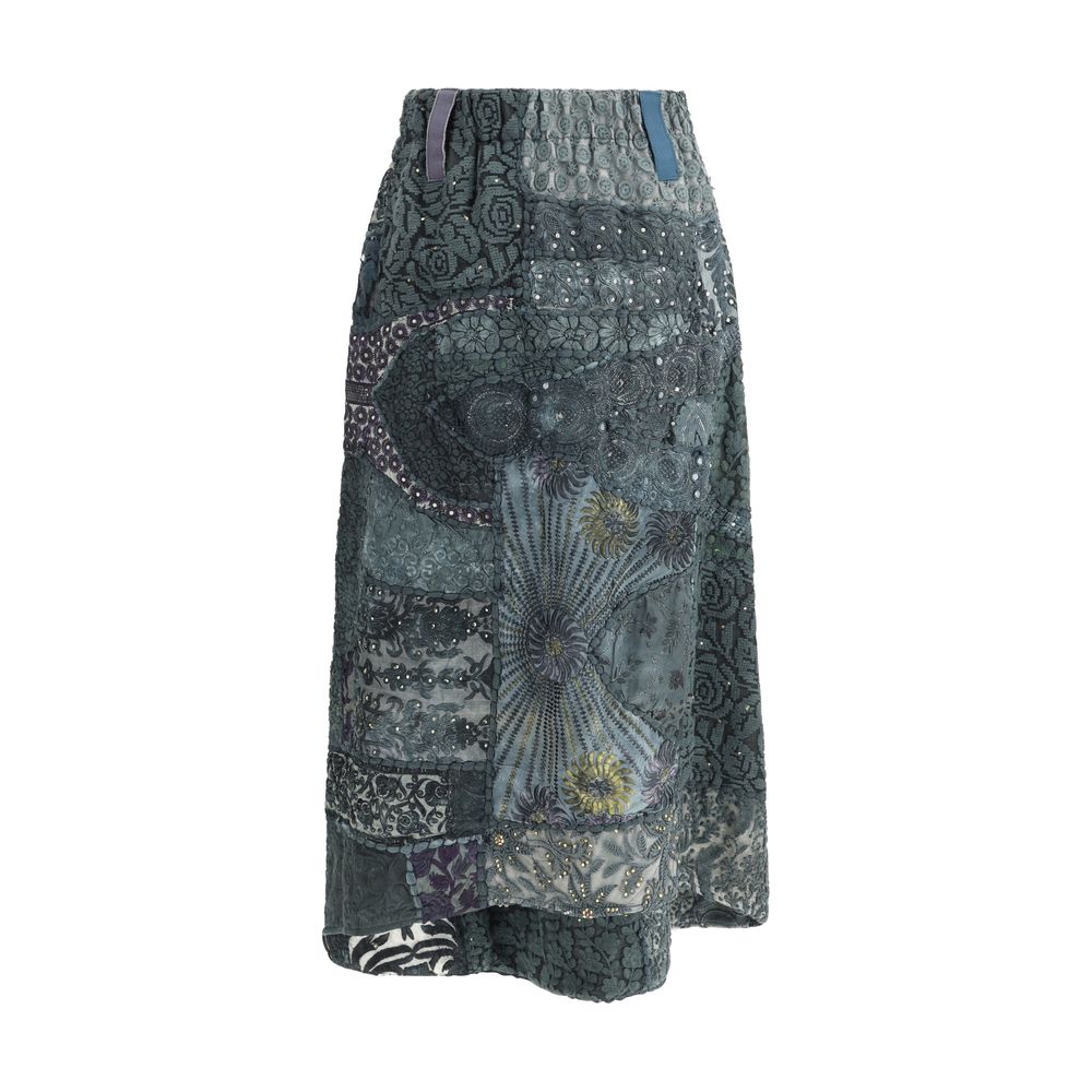 Cotton Naisha skirt by Ella, elasticized waistband, high waistband loops, two side welt pockets, patchwork with appliqued shiny jewel detailing, regular fit.
