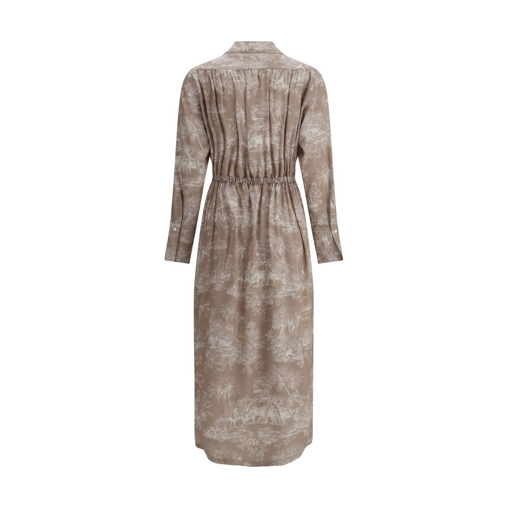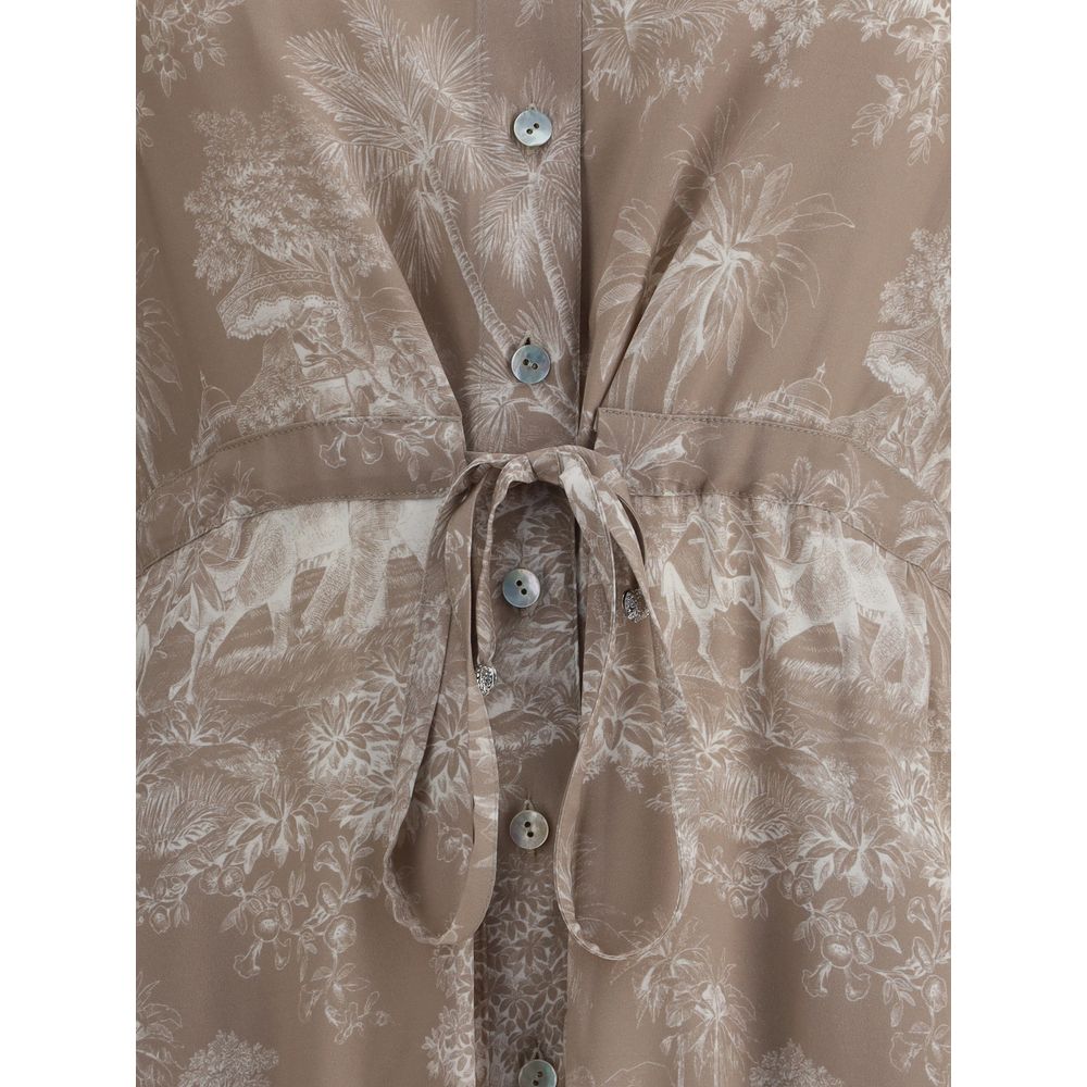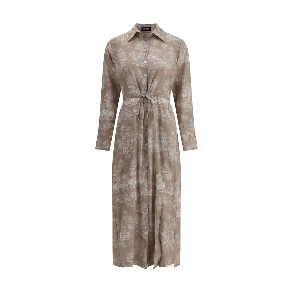 Ella’s coulisse Chemisier Dress is an elegant and sophisticated piece with a classic collar and front button closure that emphasize its refined design. The adjustable drawstring waist allows it to fit the figure perfectly, while the two side welt pockets offer practicality. The built-in V-neck slip adds a feminine touch. The Toile de jouy-style pattern, with its delicate and sophisticated pattern, lends an added accent of elegance. A perfect dress for those seeking a chic and original look.