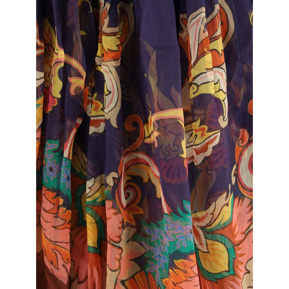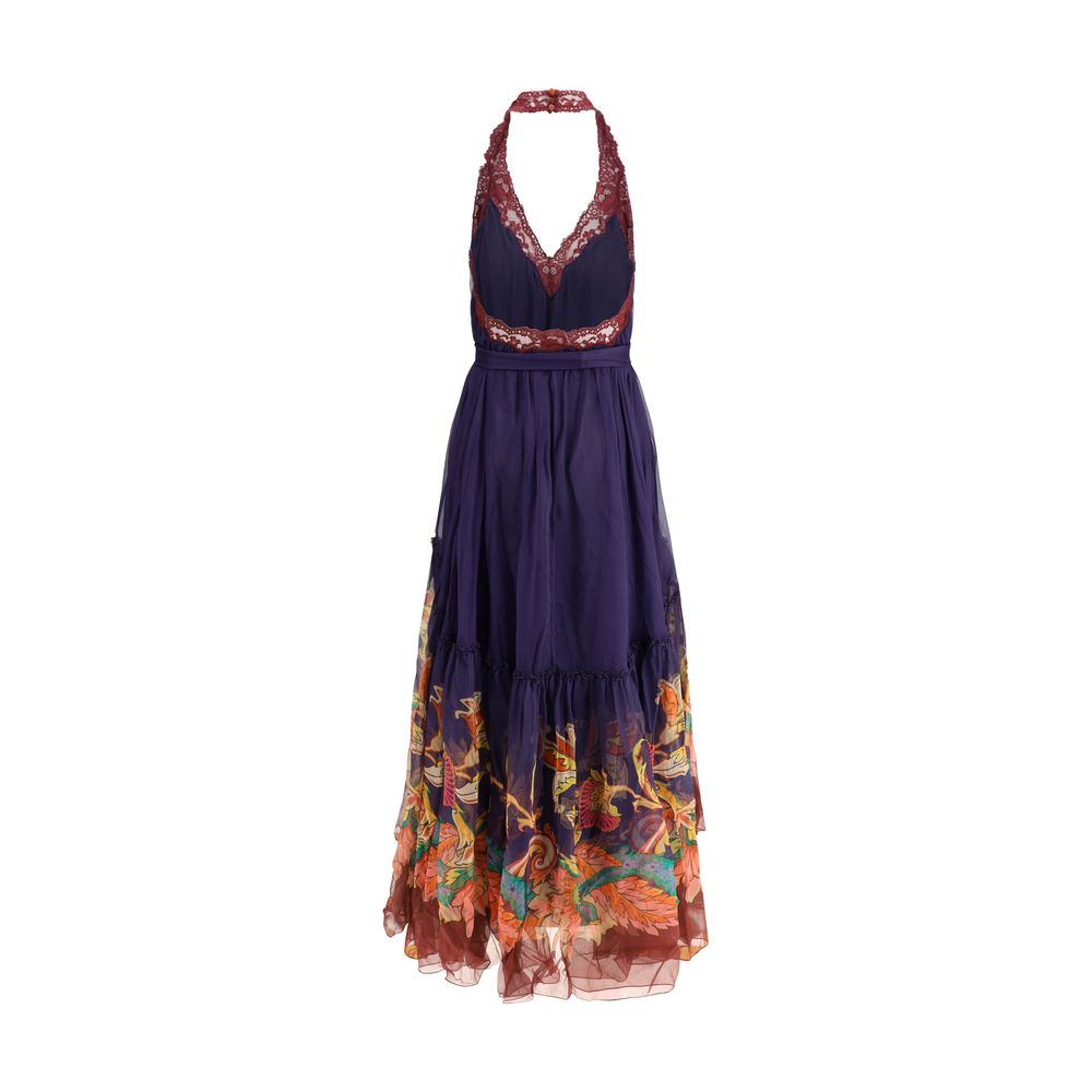 The boho-style Long Dress is made of lightweight silk crepon, with a wide skirt and voluminous flounce decorated with a scarf-inspired floral print. The top is sleeveless, with an American neckline and lace inserts, while the back remains uncovered, adding a touch of sensuality. The dress closes at the back with a button and includes a soft sash, which can be worn as a belt or as a scarf, completing the look with a touch of elegance.