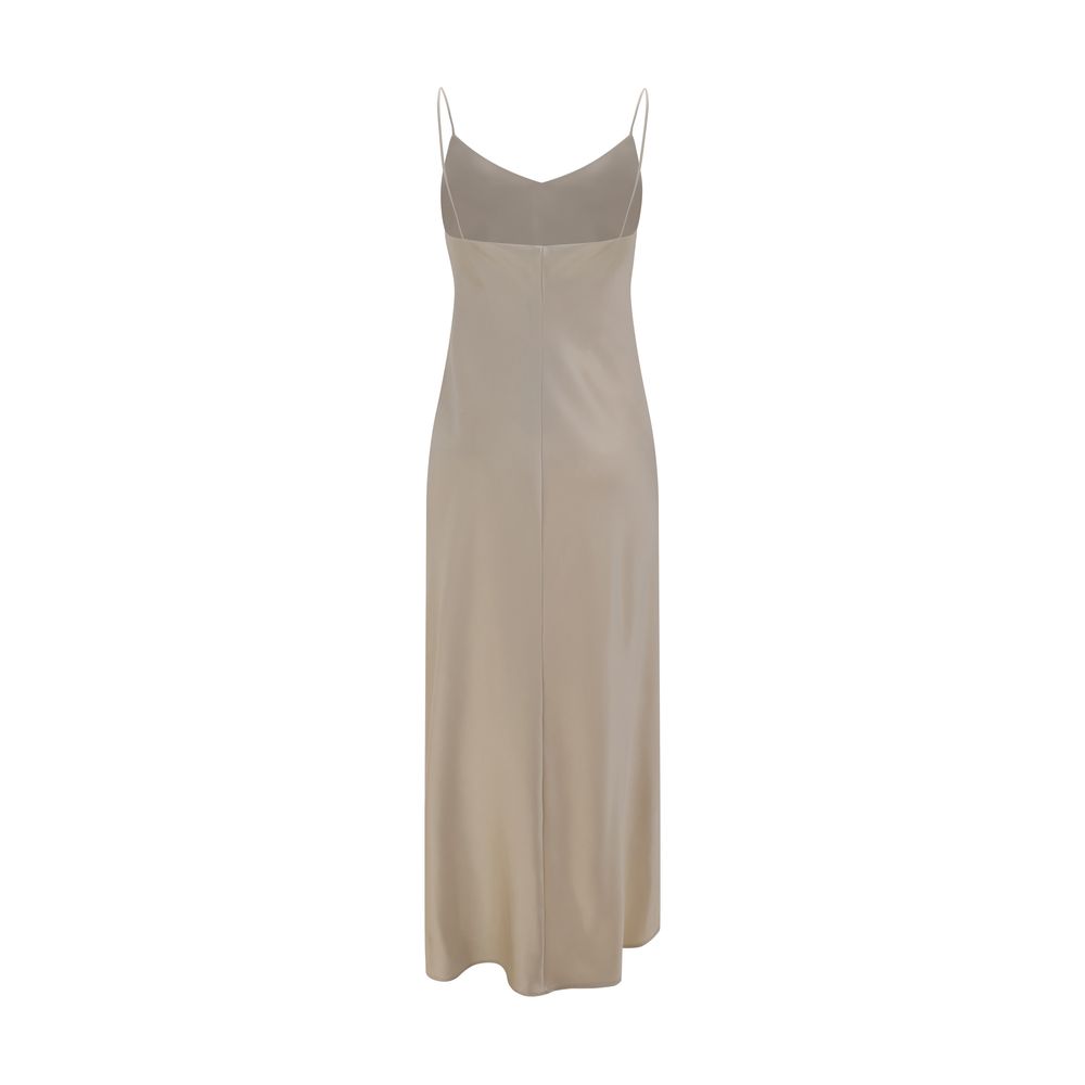 Dress by F.IT, thin shoulder straps, foot-length, soft V-neck at front, slim fit, monochrome pattern.