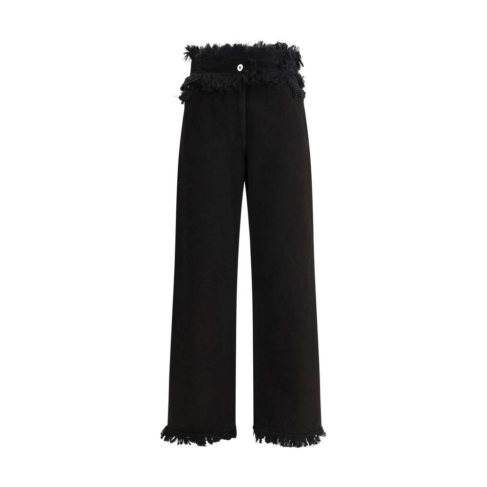 Ferragamo Jeans are a garment that combines comfort with luxury, with a design that conveys contemporary elegance. The wide leg model offers a loose and relaxed fit, ideal for those seeking a modern style but without sacrificing practicality. The high waist enhances the silhouette, while the front button and zipper closure adds a classic and functional detail. The brand’s signature leather patch applied on the back lends a distinctive and recognizable touch. Frayed edges at the waistband and hems give a more relaxed and contemporary style effect, creating an interesting contrast to the garment’s sleek design.