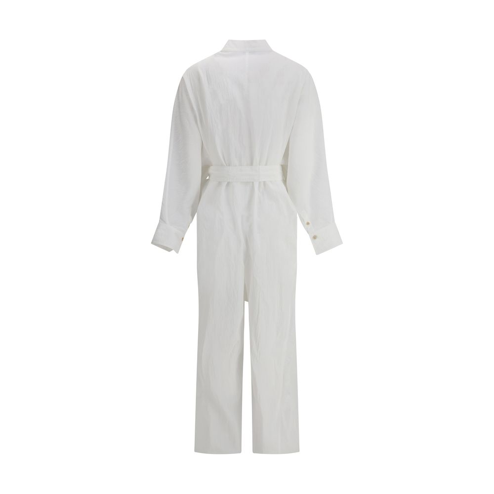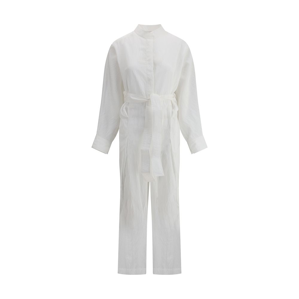 Sash Jumpsuit by Ferragamo, made of crinkled fabric for a sophisticated, modern effect. The design features a mandarin collar, half-bust closure with concealed buttons, and wide batwing long sleeves that add volume and movement. Side sashes allow the waist to cinch in, enhancing the silhouette with elegance.