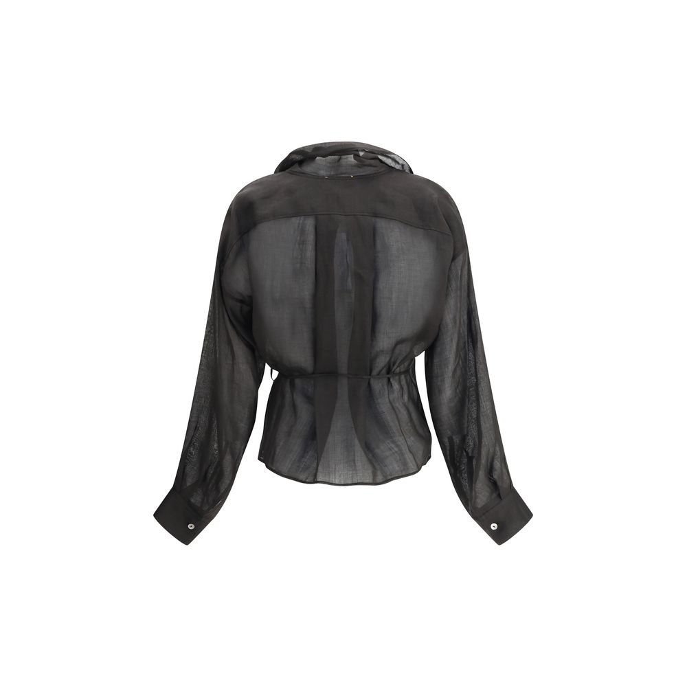 Forte_Forte’s Crossed shirt is a sleek, modern piece featuring shawl lapels that add a sophisticated touch. The dropped shoulders create a relaxed, flowing silhouette, while the knotted ribbon front closure lends a delicate, feminine accent. The semi-transparent design gives a light and airy effect, making it ideal for a refined and versatile look.