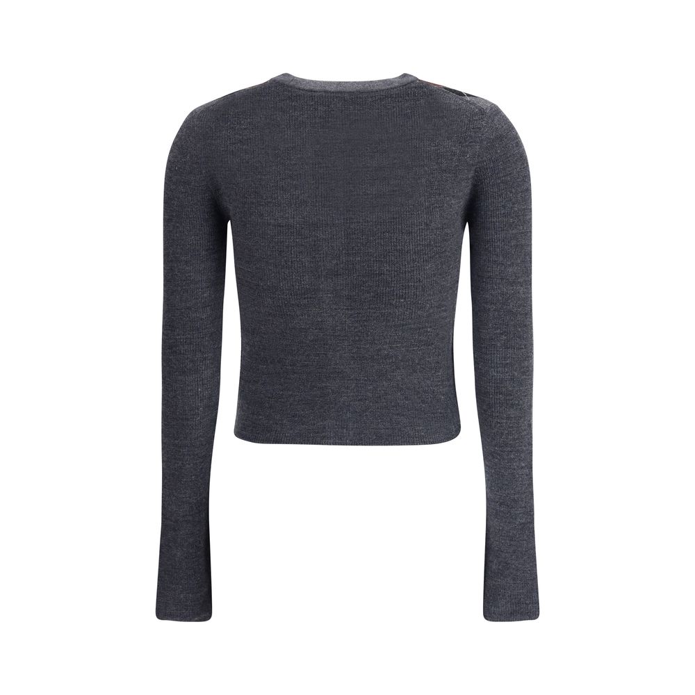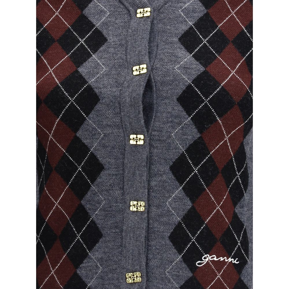 Ganni’s check Cardigan is an elegant and versatile piece featuring a V-neck that enhances its femininity. The front closure with logo buttons and the brand’s iconic signature stitched on the front add a distinctive touch. The timeless and refined check pattern makes it a perfect piece for a sophisticated yet casual look.
