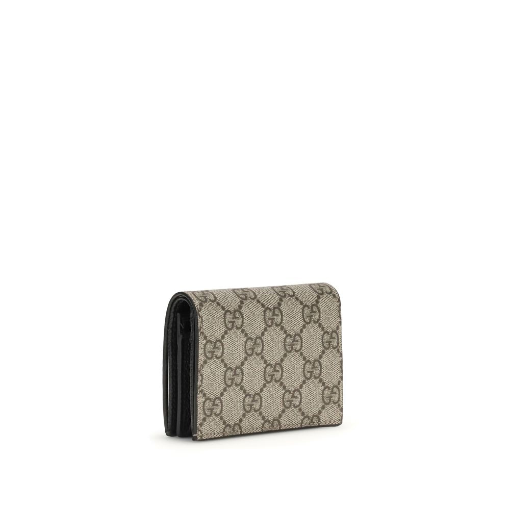 Gucci’s GG Marmont Card Holder combines functionality with iconic style. Made of black leather with beige and dark brown GG Supreme canvas inserts, it is embellished with gold-tone hardware and the emblematic Double G on the front. The interior features five card slots, an open pocket, a zippered pocket and a bill compartment. The snap closure completes the compact and elegant design, perfect for everyday use with a touch of class.