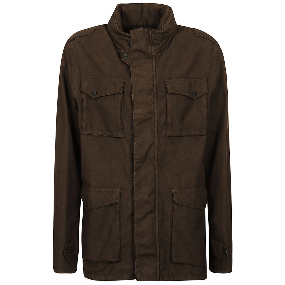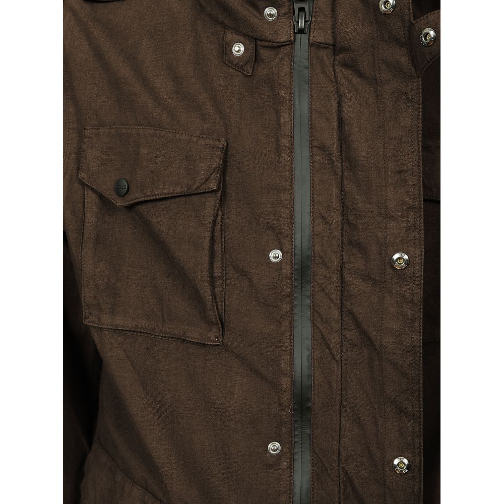 Herno Field Jacket in brown linen, multi-pockets on the front, zip and button fastening, adjustable cuffs, hood foldable into the collar
