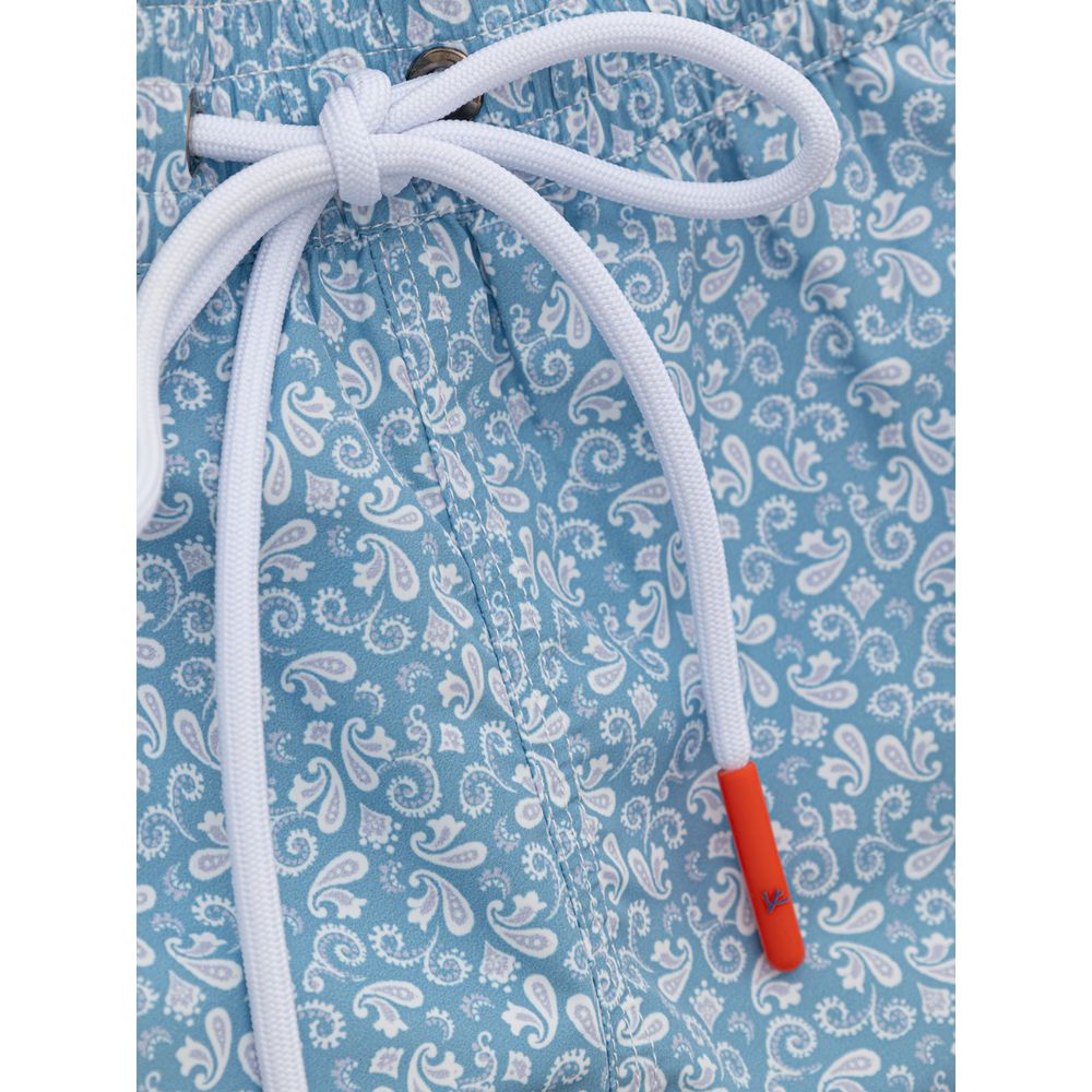Isaia Blue Boxer Costume with Cashmere Print. In blue with allover white cashmere print, elastic waist with adjustable drawstring and rubber grommets, two side welt pockets, internal mesh. Super light technical fabric, for quick drying.