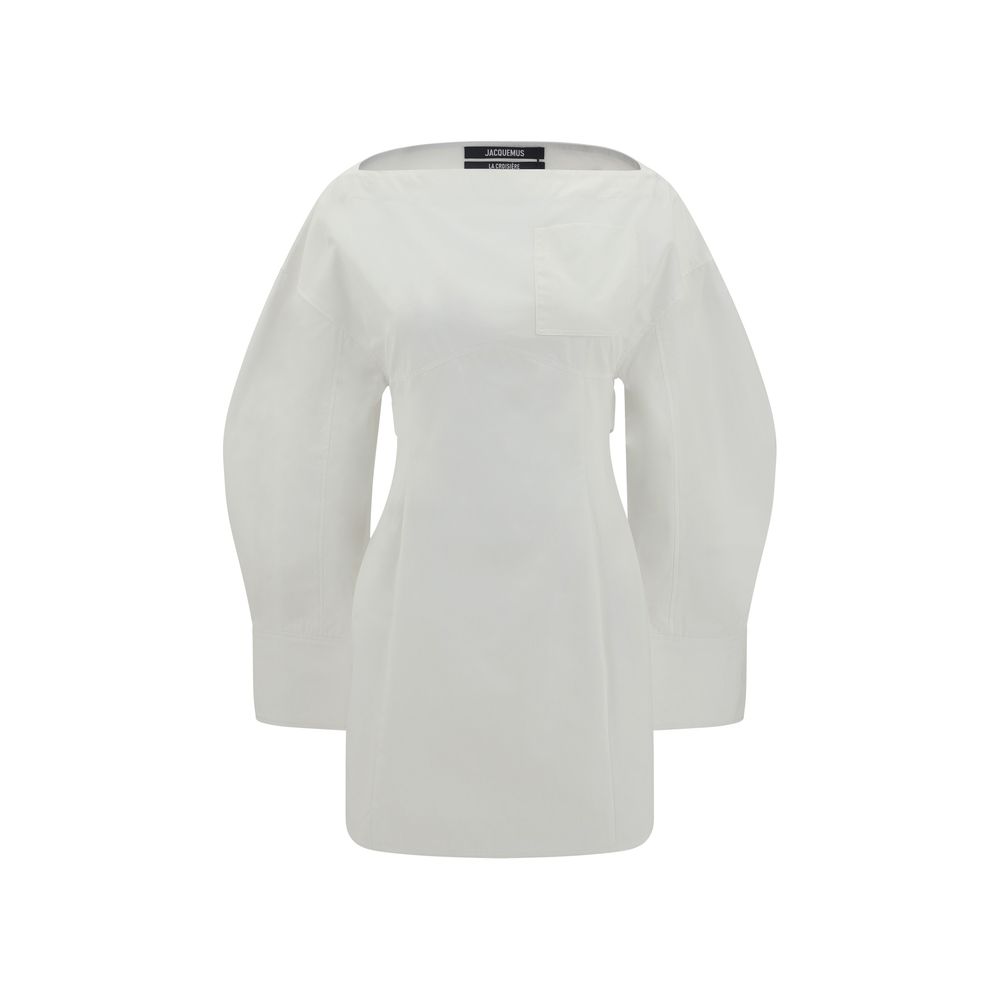 The Jacquemus Casaco mini Dress features an off-shoulder design with long balloon sleeves that create a voluminous and sophisticated effect. The cut-out detail on the back adds a bold touch, while the adjustable fit with a buckle at the back ensures a perfect silhouette. The front patch pocket and hidden zip closure at the back complete the look, balancing elegance and originality.