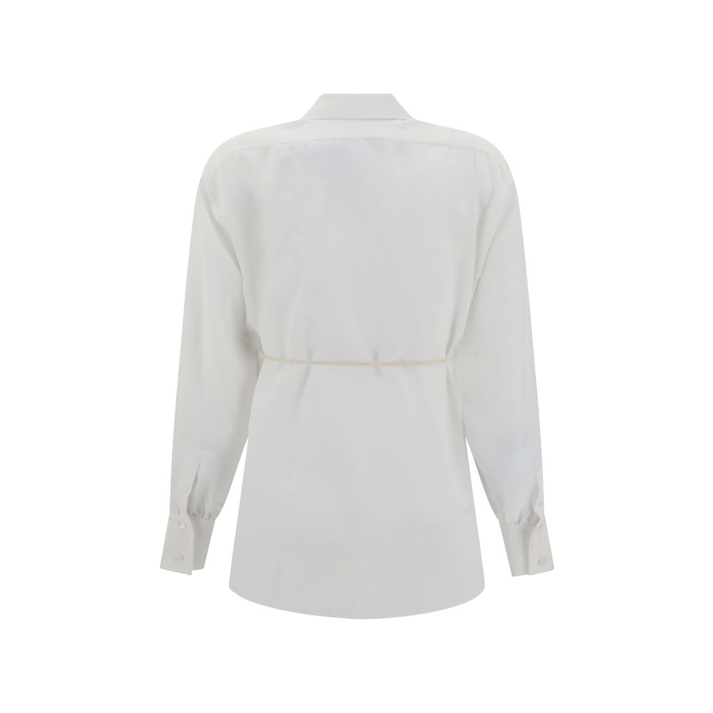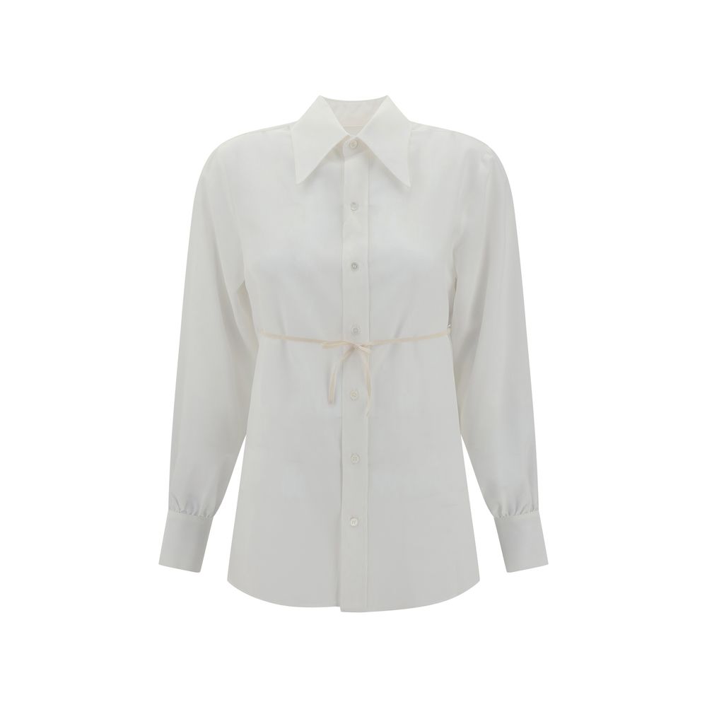 MM6’s silk Shirt is an elegant and sophisticated piece, featuring a pointed collar that enhances its refined design. The front button closure adds a classic touch, while the two side slits offer greater freedom of movement and a more fluid effect. The removable and knotted ribbon detail at the waist allows you to customize the fit, creating a defined and feminine silhouette. A versatile garment, perfect for both formal and more casual-chic looks.