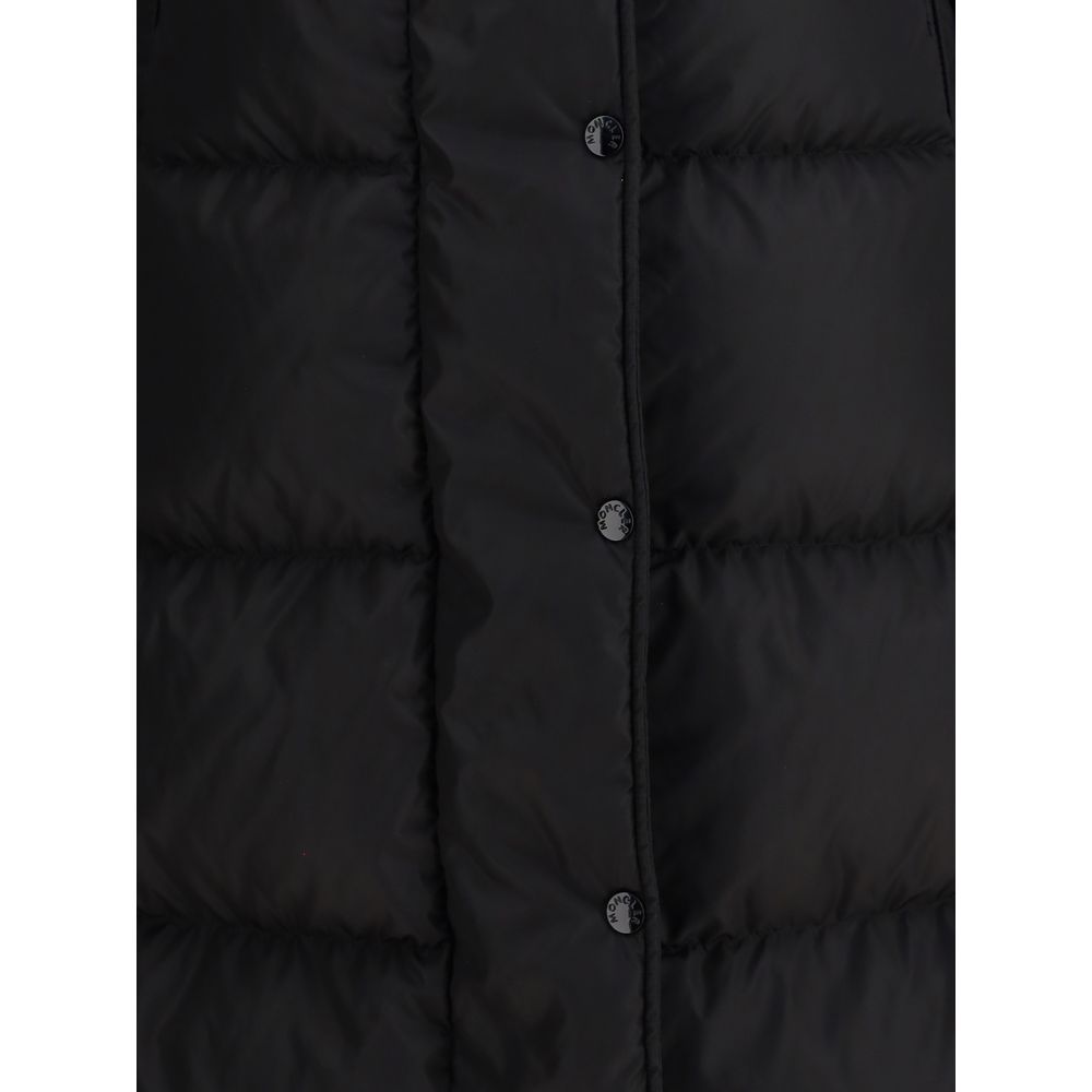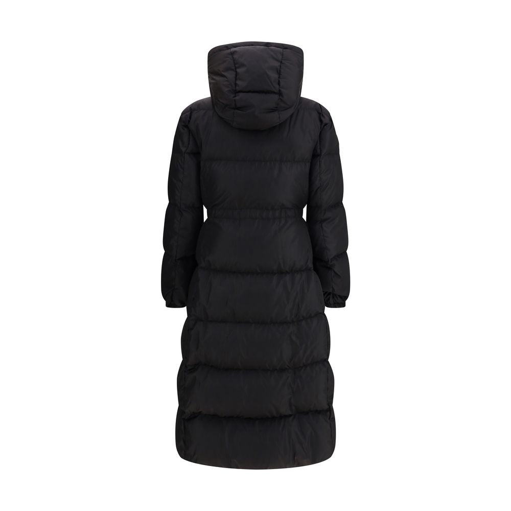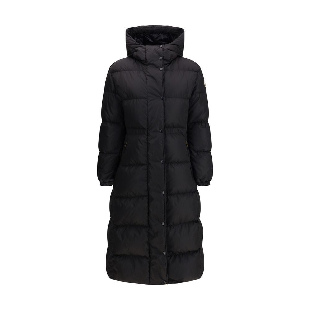 The long Moncler down jacket with hood in black nylon technique is padded and made from water-repellent fabric. Featuring a longue saison lining, it comes with a detachable and adjustable hood, removable knitted turtleneck, and zip and snap button closure. Welt pockets, drawstring waist, and elasticated cuffs complete the design, combining practicality with style.