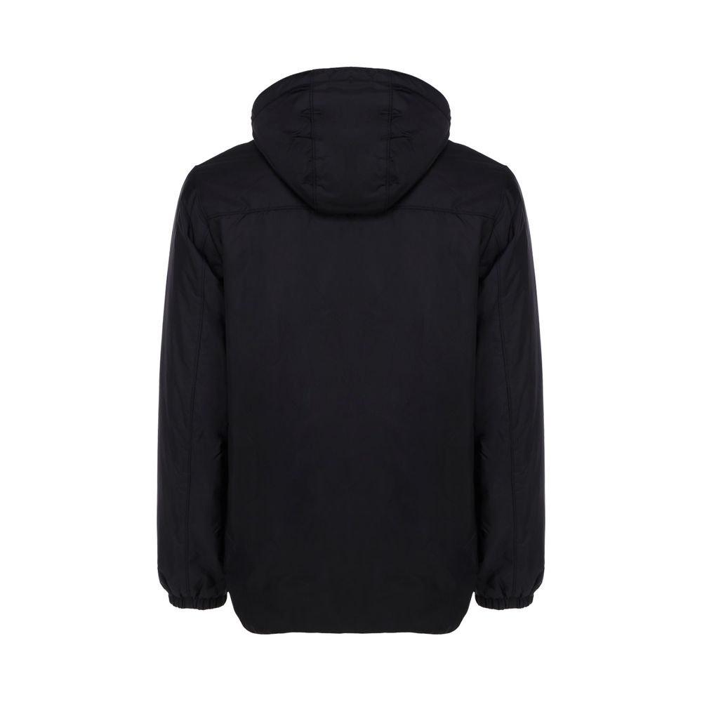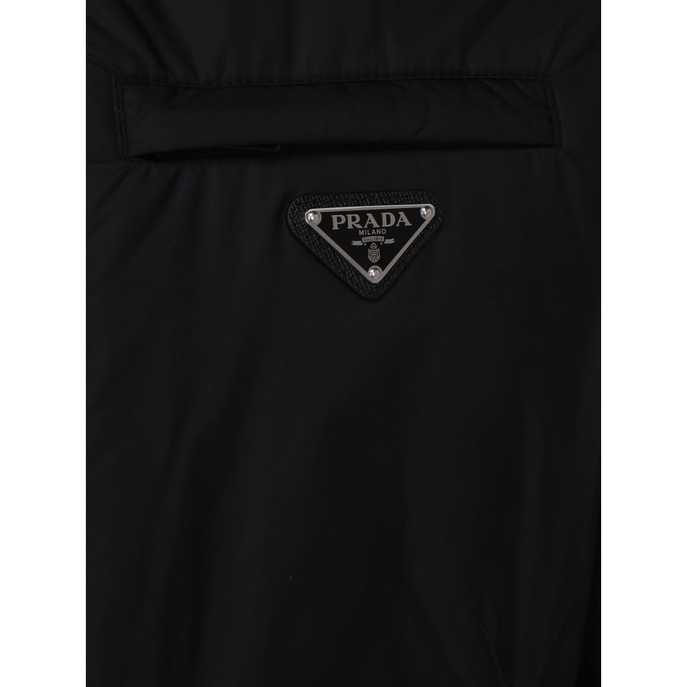 Down Jacket by Prada, zip closure, three zip welt pockets on front, triangle iconic logo plaque on front, adjustable drawstring hoodie, two internal welt pockets one with zip.