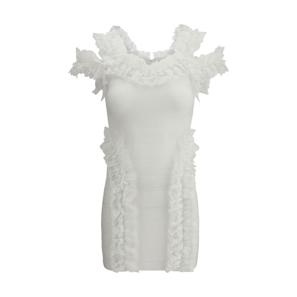 The mini Knit Ruffle Dress by Self-Portrait is a sophisticated and feminine piece made of knit fabric that gracefully adheres to the silhouette. It features a sweetheart neckline that enhances the neckline, while the double lace straps add a delicate and romantic touch. The horizontal striped design creates an elegant and modern visual effect, while the lace detail along the sides lends an added accent of sophistication. The back zipper ensures a discreet and perfect closure. This dress is ideal for special occasions, combining elegance and sensuality with a modern twist.