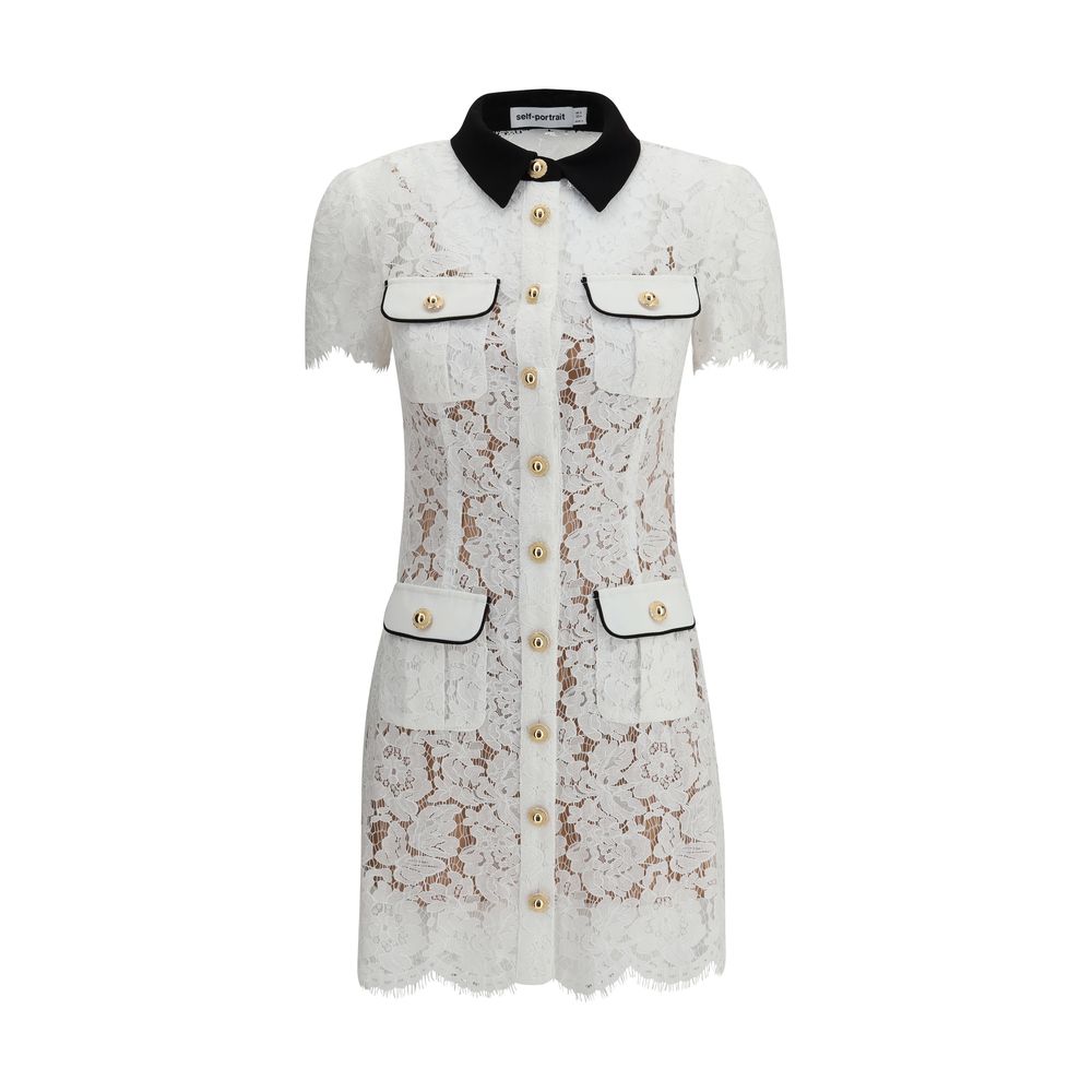 Self-Portrait’s lace short Dress combines romance and modernity in an elegant design. Featuring a contrasting classic collar and short sleeves, it has a front closure with embossed buttons and four front patch pockets with flaps, adding a practical and refined touch to the garment.