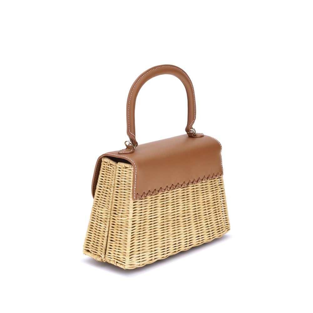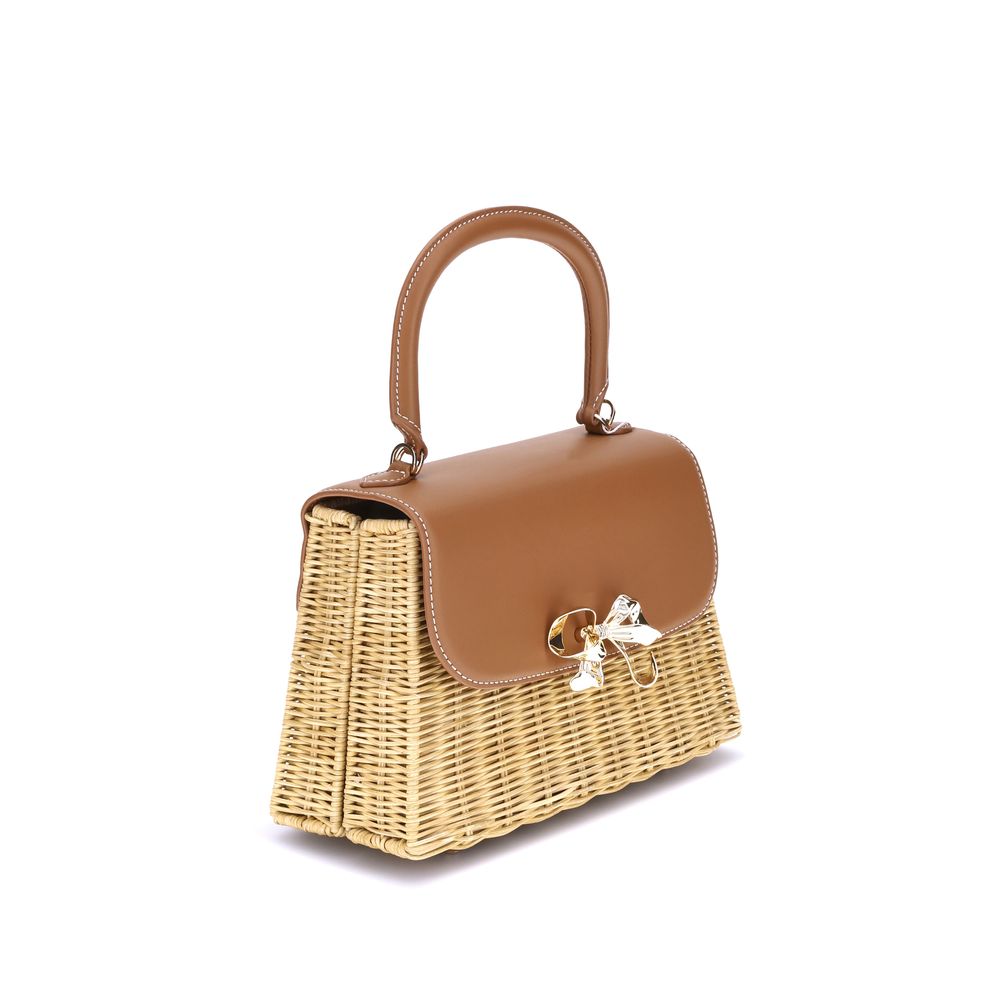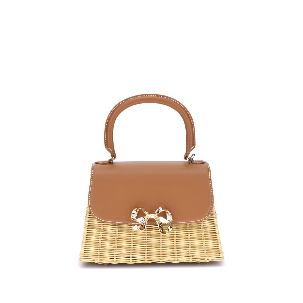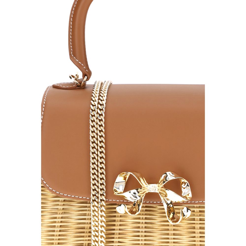 Self-Portrait’s Bow Handbag combines boho spirit with refined elegance. Made of rattan with leather detailing, it features a compact and refined design framed by a textured top handle and embellished with a large decorative gold bow. The flap closure ensures practicality, while the removable shoulder strap offers versatility, making it perfect for both hand and shoulder carry.