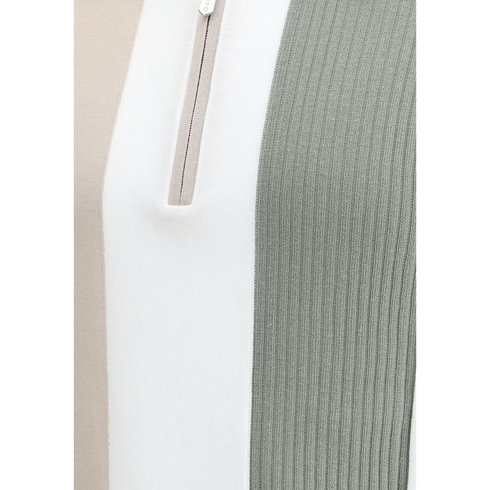 The Svevo cotton Polo Shirt is an elegant and contemporary piece. It features a classic collar that adds a refined touch, while the zip closure on the front offers practicality and a modern design. The knitted fabric is enriched with a vertical striped pattern, which gives movement and dynamism to the piece. The ribbed hem ensures a comfortable and well-defined fit, completing the look with a stylish detail.